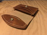 This wallet is hand-made using Conceria Walpier Museum Veg Tan Chestnut leather and Ritza Havana Cigar, Col. Tan, and Pear thread. Closure snap is Brass line 20.