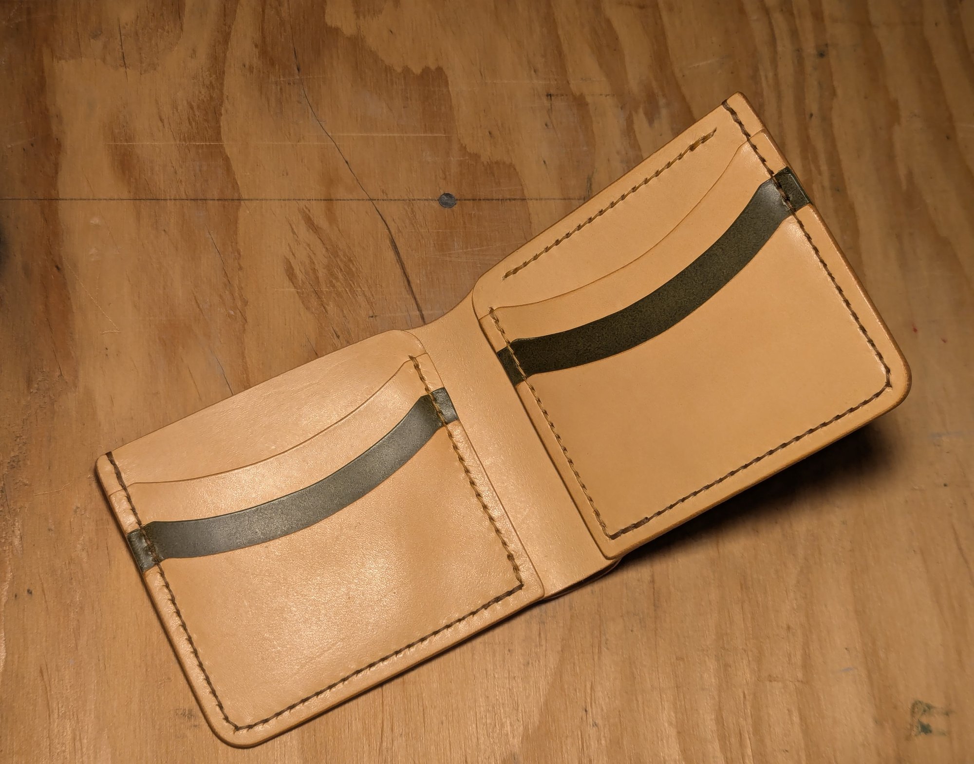 This wallet is hand made using Conceria Walpier Buttero Natural Veg Tan Leather with a hint of Olive accents on 2 of the pockets, and sewn together with waxed Ritza Tiger Thread in Col. Tan. The leather will develop a rich brown patina, and continue to darken with use.