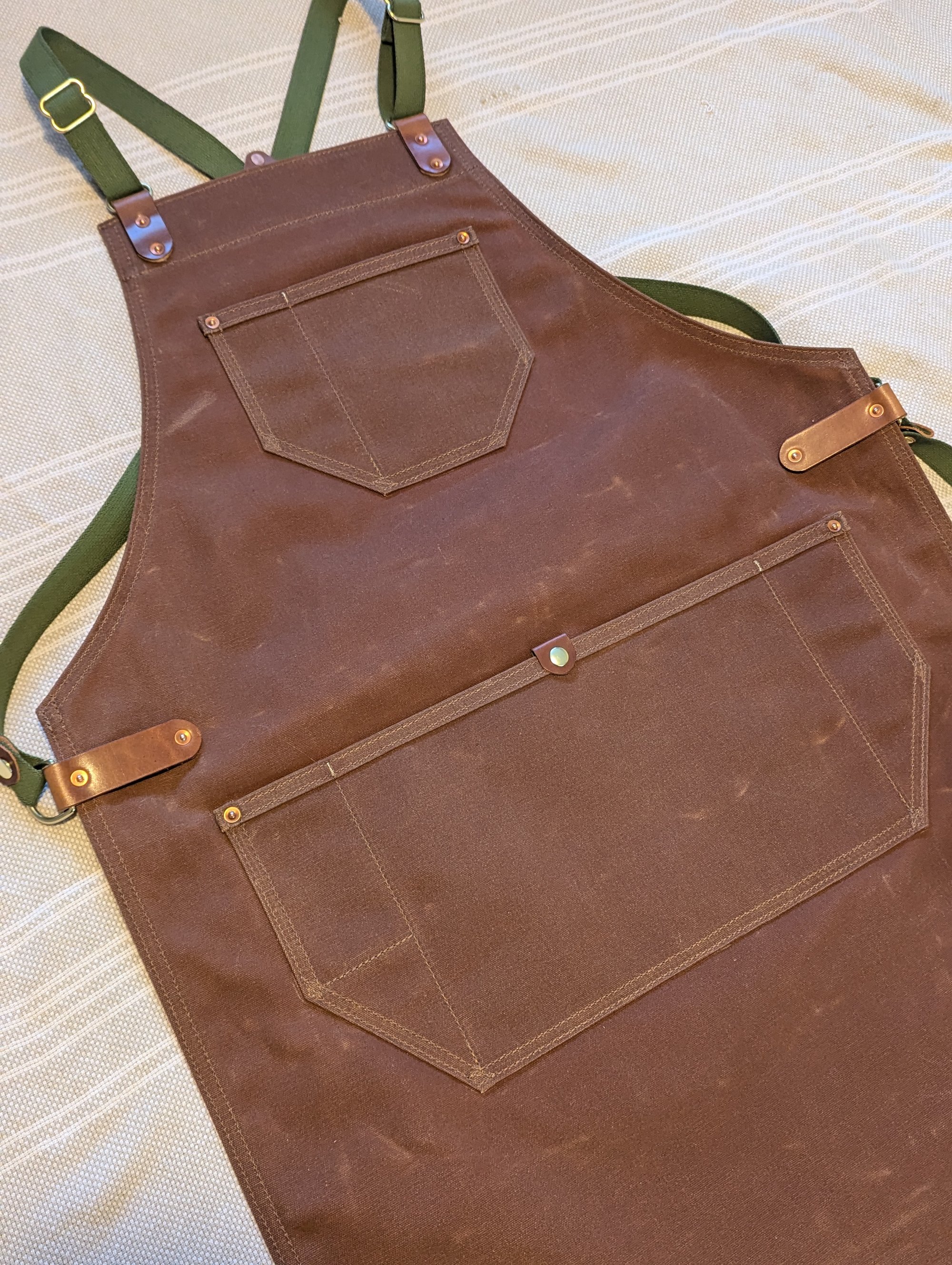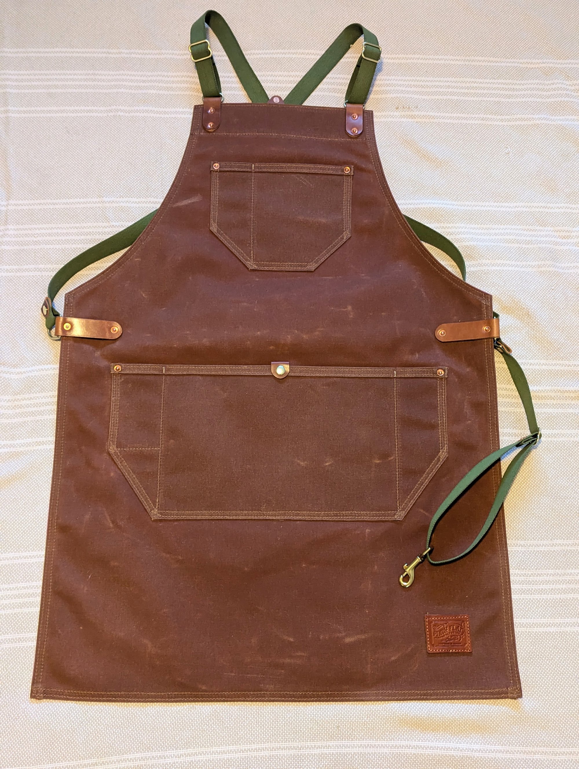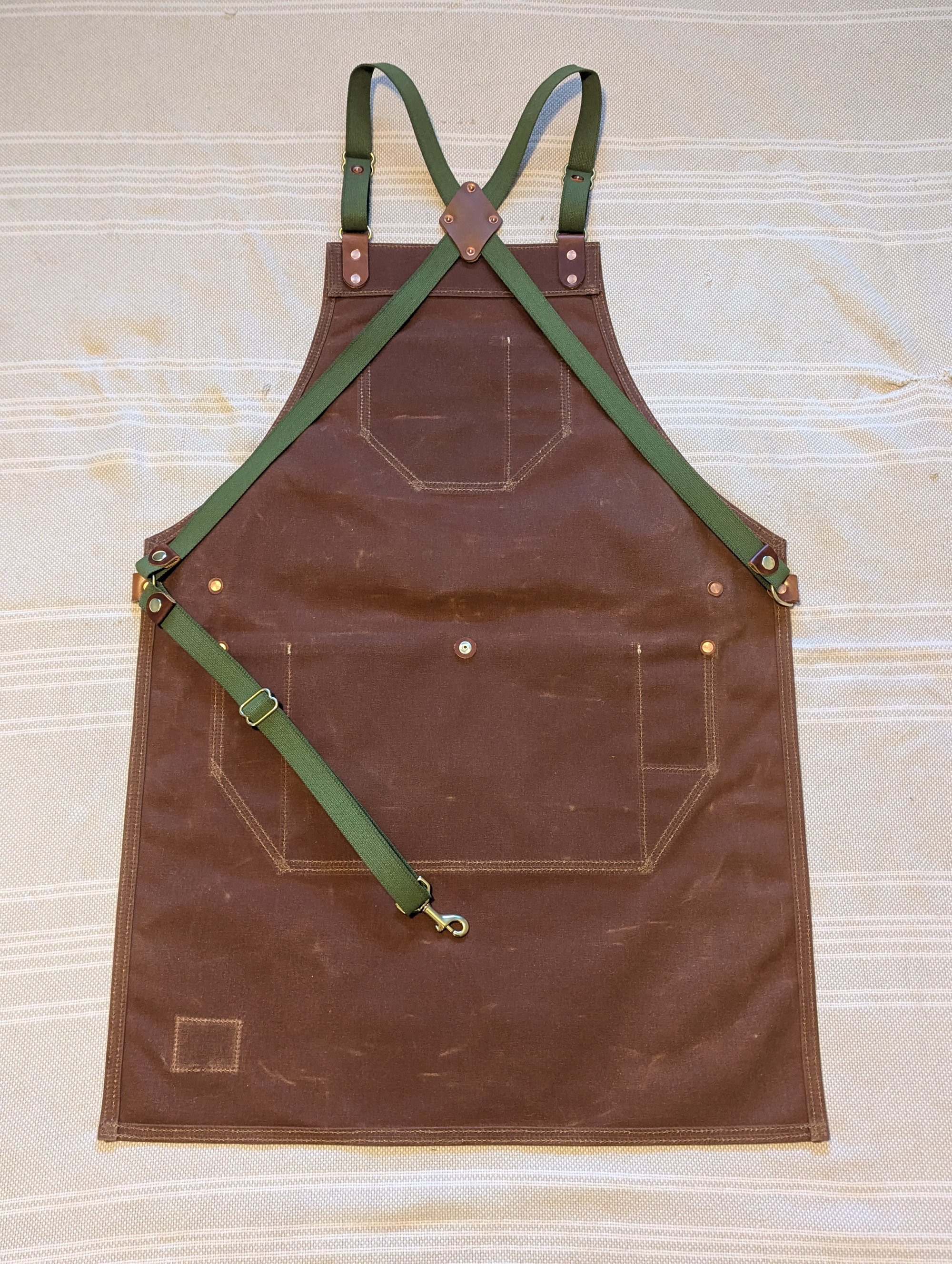 This particular apron is constructed using 20oz. Copper Brown Waxed Canvas, Olive Color Webbing, W&C Harness Leather, and Solid Brass Hardware.